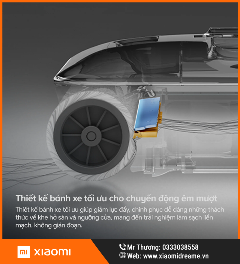 Trên thực tế, đây là yếu tố rất quan trọng với máy hút bụi lau sàn cầm tay, vì sản phẩm thường phải di chuyển liên tục qua nhiều phòng. Khi bánh xe và trọng tâm máy được tối ưu tốt, người dùng sẽ dễ chuyển hướng, ít bị nặng tay và kiểm soát máy chính xác hơn, đặc biệt khi làm sạch ở các khu vực hẹp hoặc cần đổi hướng liên tục. Với gia đình sử dụng máy mỗi ngày, trải nghiệm “đi nhẹ, xoay mượt” là khác biệt đủ lớn để cảm nhận rõ.
