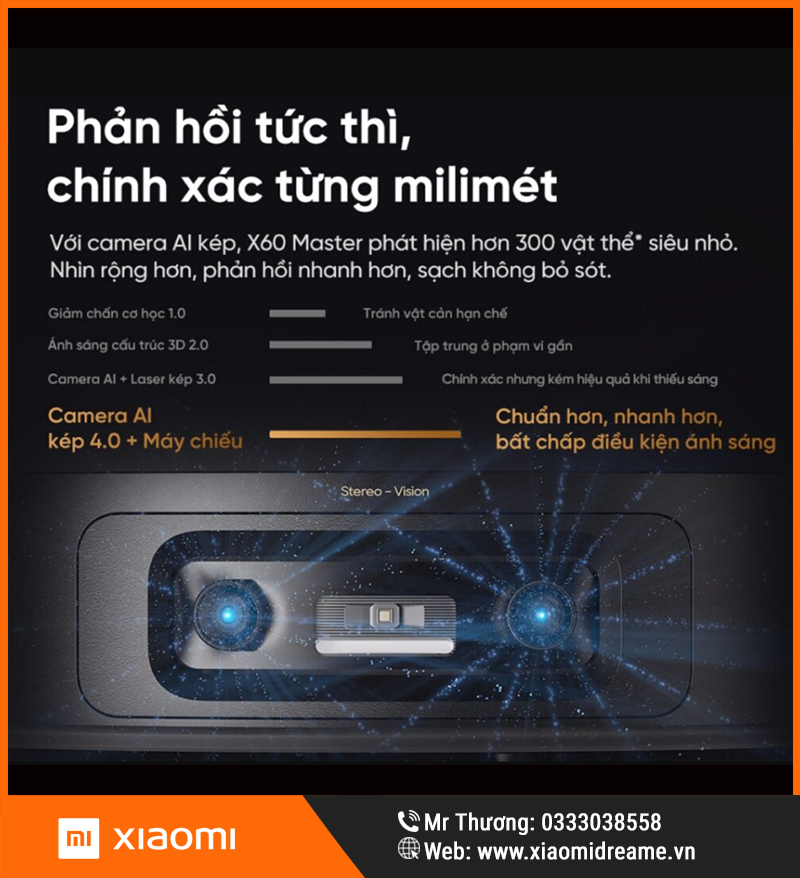 | Tránh vật cản | Camera AI x2 + cảm biến 3D cạnh bên + đèn LED |