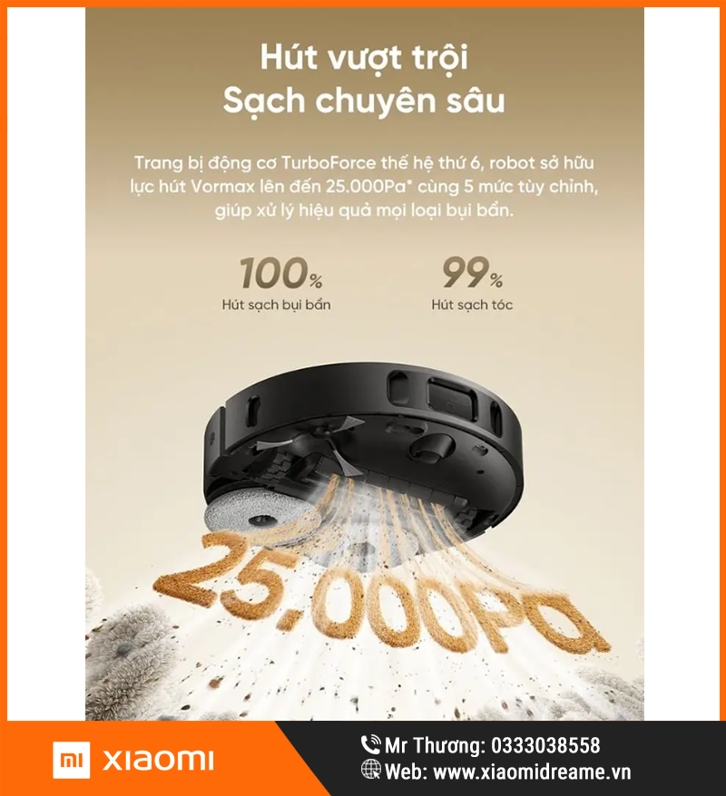 Điểm nổi bật đầu tiên của Dreame D30 Ultra – Bản Quốc Tế chính là lực hút Vormax mạnh mẽ lên tới 25.000Pa. Đây là mức lực hút cao, cho phép robot xử lý nhanh và hiệu quả nhiều loại bụi bẩn trong sinh hoạt hằng ngày như bụi mịn, tóc rụng, lông thú cưng, vụn bánh hay các mảnh rác nhỏ trên sàn.