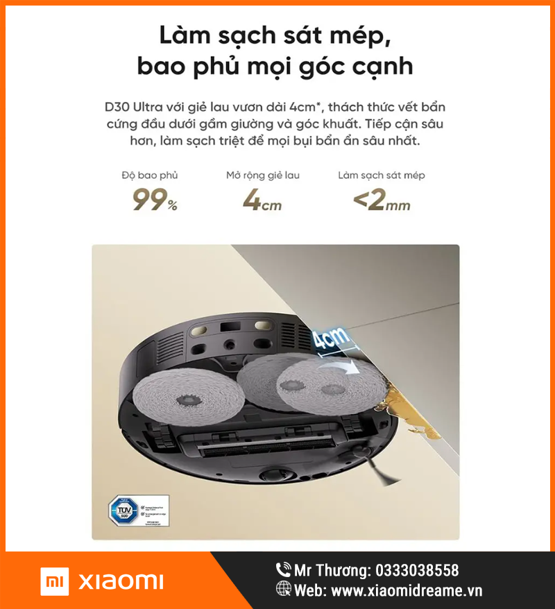 Một trong những điểm nâng cấp đáng chú ý trên Robot hút bụi lau nhà Dreame D30 Ultra là công nghệ MopExtend RoboSwing, giúp giẻ lau mở rộng linh hoạt để tiếp cận các vị trí sát mép tường, góc nhà, chân bàn, chân ghế và những khu vực khó làm sạch.