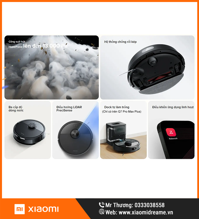 Điểm nổi bật nhất của Roborock Q7 Pro Max là lực hút HyperForce 13.000Pa. Bigmi mô tả mức lực hút này có thể loại bỏ hiệu quả bụi bẩn sâu trong khe sàn và thảm, trong khi trang Q7 Series của Roborock cũng xếp model này ở mức 13.000Pa trong cùng dòng sản phẩm.