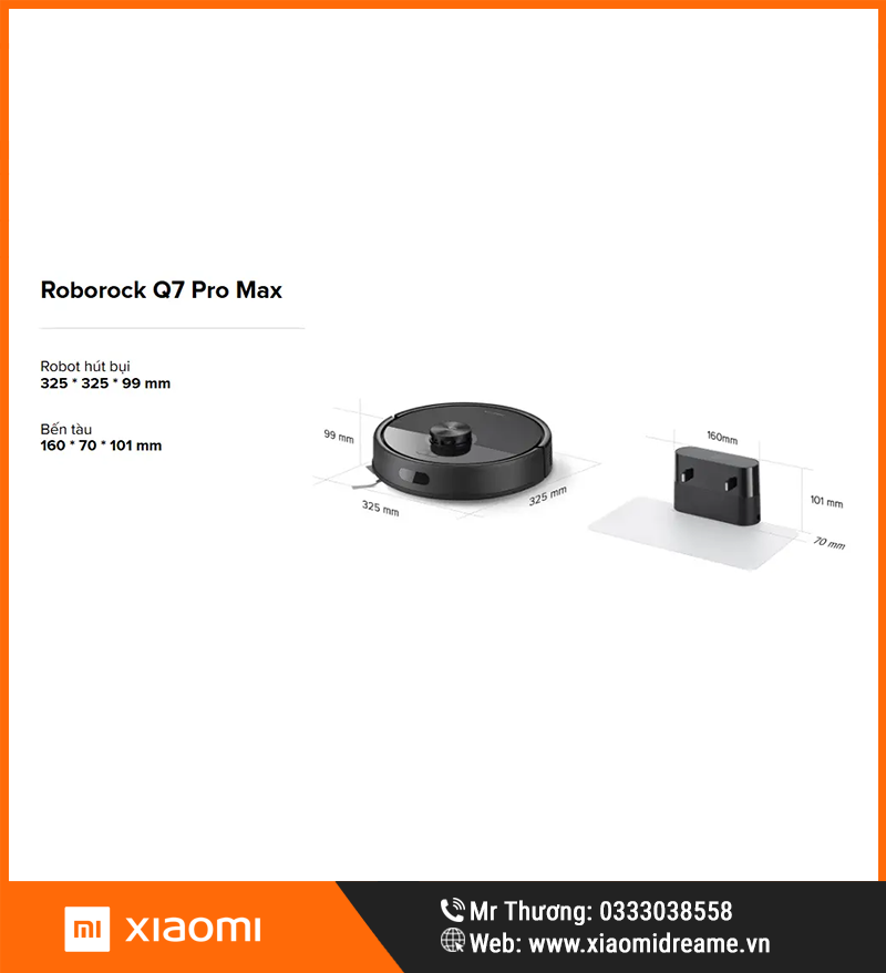 Theo trang Q7 Series của Roborock, Q7 Pro Max có kích thước khoảng 325 x 325 x 99 mm, phù hợp với kiểu thiết kế robot hút bụi tròn truyền thống, gọn gàng và dễ di chuyển trong hầu hết không gian gia đình. Dock sạc bản thường có kích thước khoảng 160 x 70 x 101 mm, giúp tiết kiệm diện tích đặt máy.