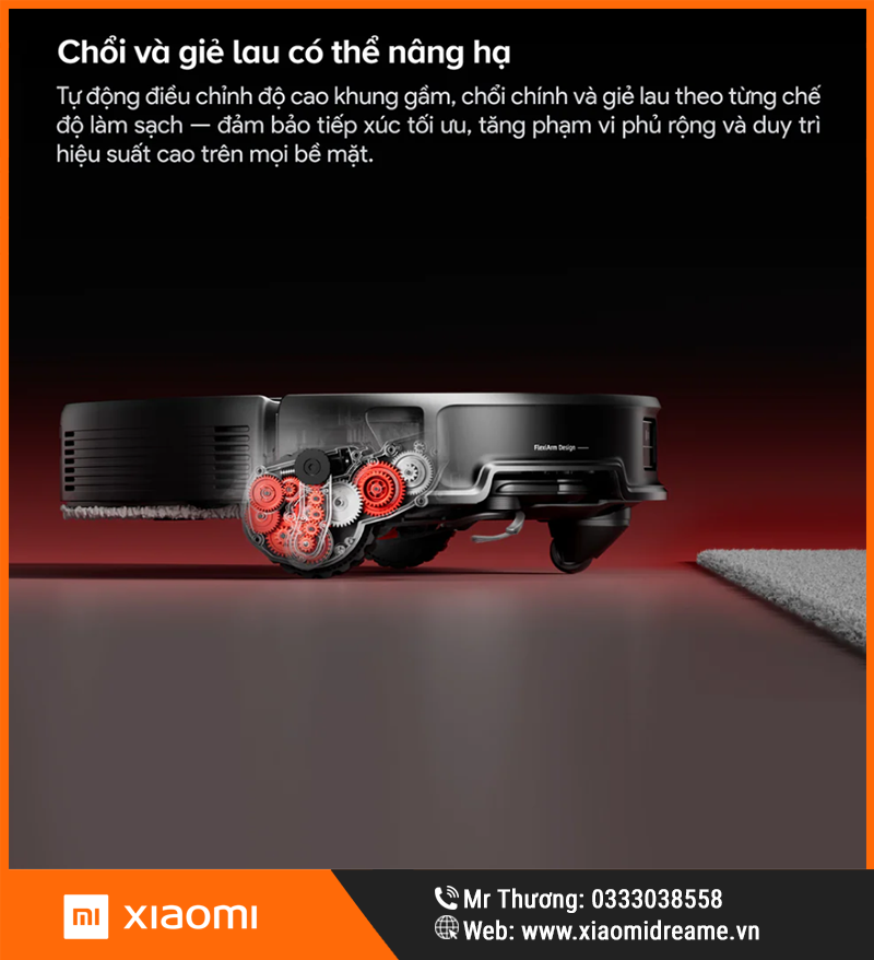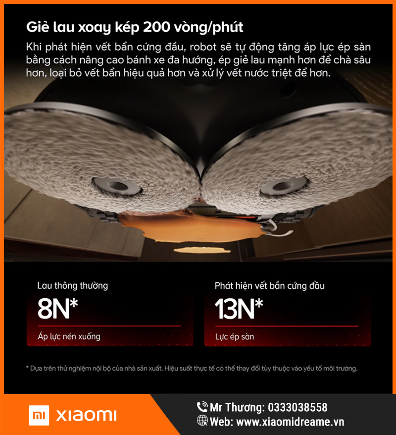 Lau nhà của robot thường gây tranh cãi vì nhiều máy chỉ kéo giẻ ẩm, dễ để vệt. Giẻ xoay kép 200 vòng/phút giúp tăng ma sát, hợp với nhu cầu “lau duy trì” của nhà Việt: